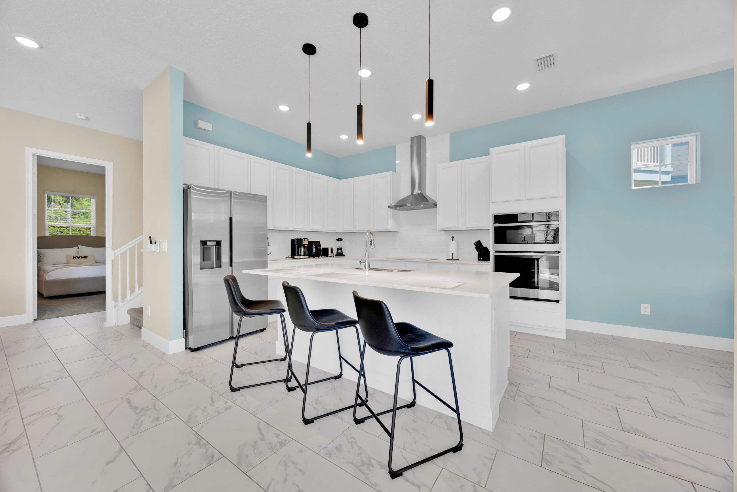 Entre nesta espaçosa vila que se abre para uma ampla sala de estar em plano aberto. A sala de estar possui pé-direito alto, móveis elegantes, portas de correr duplas e janelas amplas que permitem a entrada de bastante luz natural. A decoração é contemporânea com um toque do charme da Flórida, incorporando tons suaves e neutros com toques de cor.