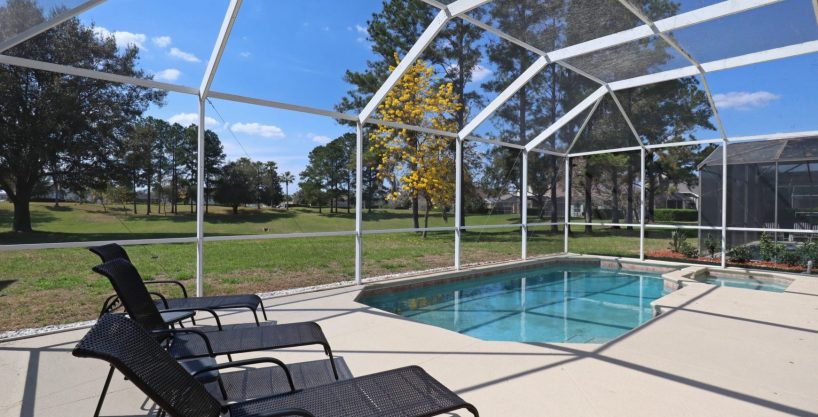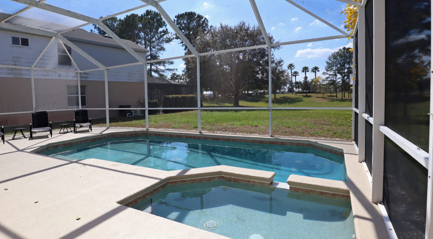 Maior do que uma piscina de casa de férias padrão com jacuzzi de grandes dimensões. Tem vista para uma maravilhosa área de conservação com pinheiros da Flórida e outras belas floras. Aquecedor de piscina novinho. A área de varanda coberta com teto alto, ventilador e luz. Uma atraente mesa de vime aguarda os convidados. Espreguiçadeiras para os banhistas.