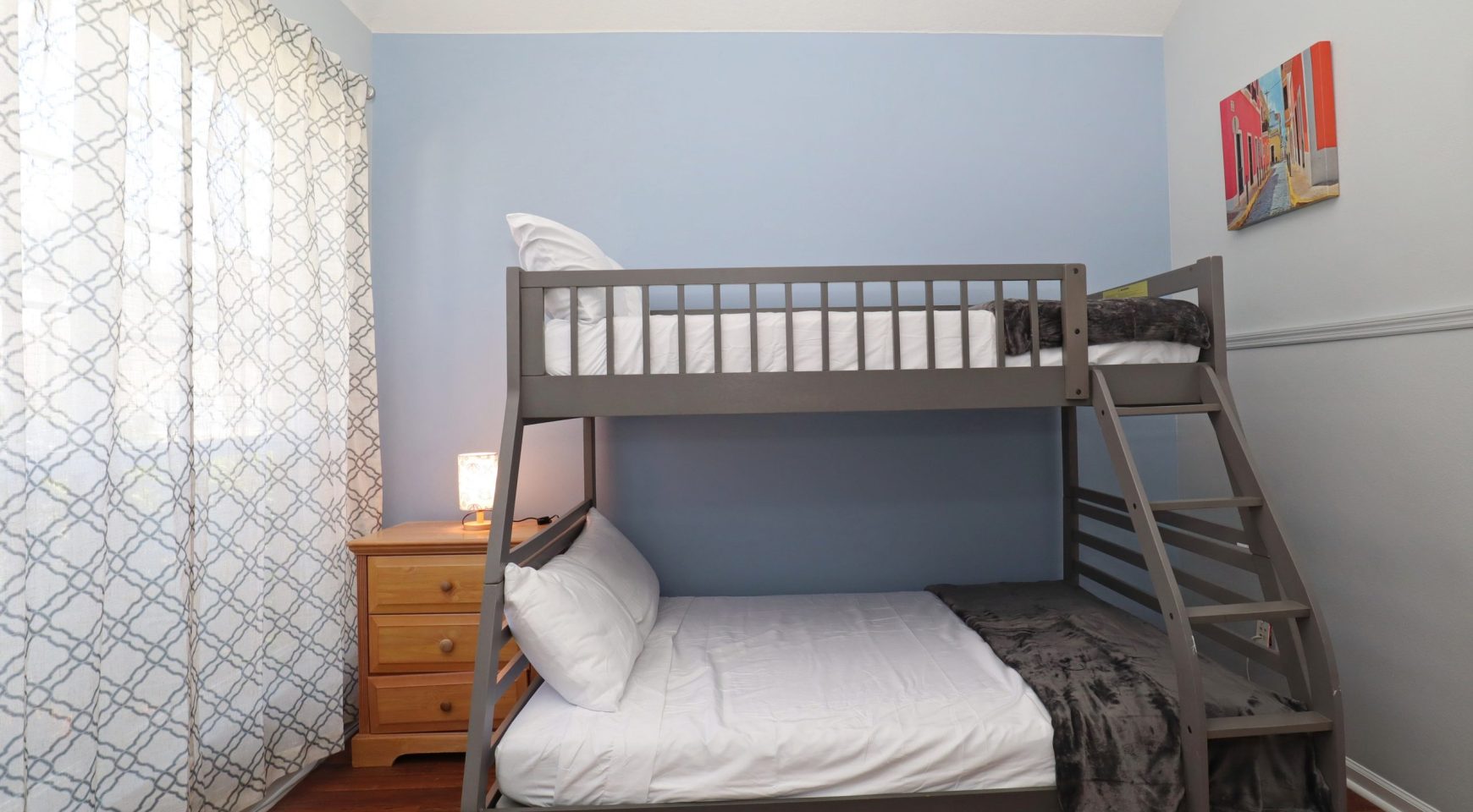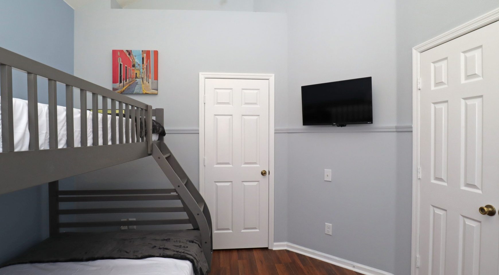 * Quarto beliche. Cama completa em baixo e solteiro em cima. Banheiro compartilhado com quarto king 2. Smart TV de 32 ″. Armário.